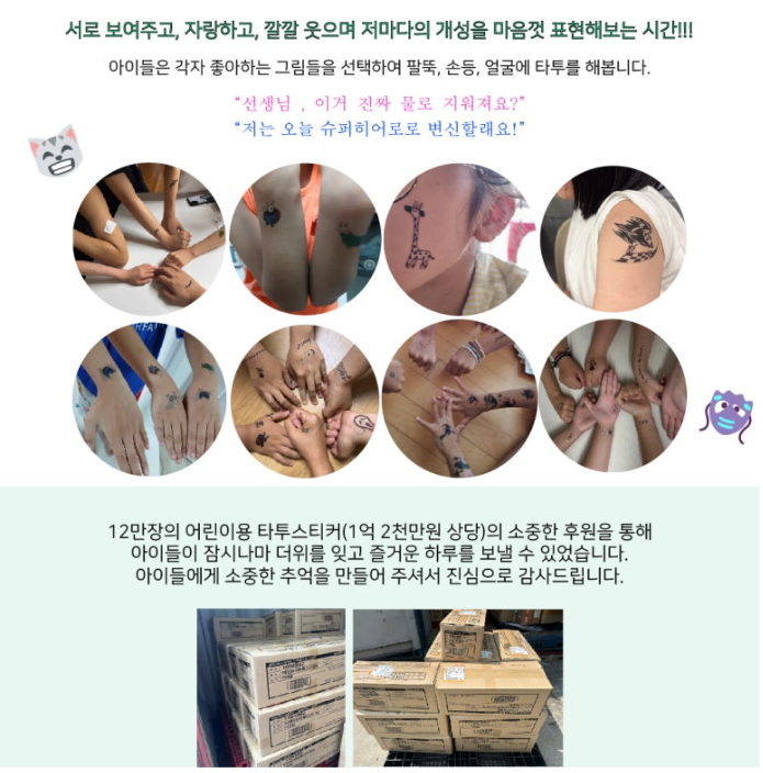 내 피부 위의 작은 예술관, 어린이용 타투 스티커 전달 등록일2025.08.14 조회수91 댓글 0댓글쓰기 댓글목록 등록된 댓글이 없습니다. 이전글 후원 물품 전달 후기 다음글 꿈을 키워가는 아이들에게 전한 따뜻한 응원 목록